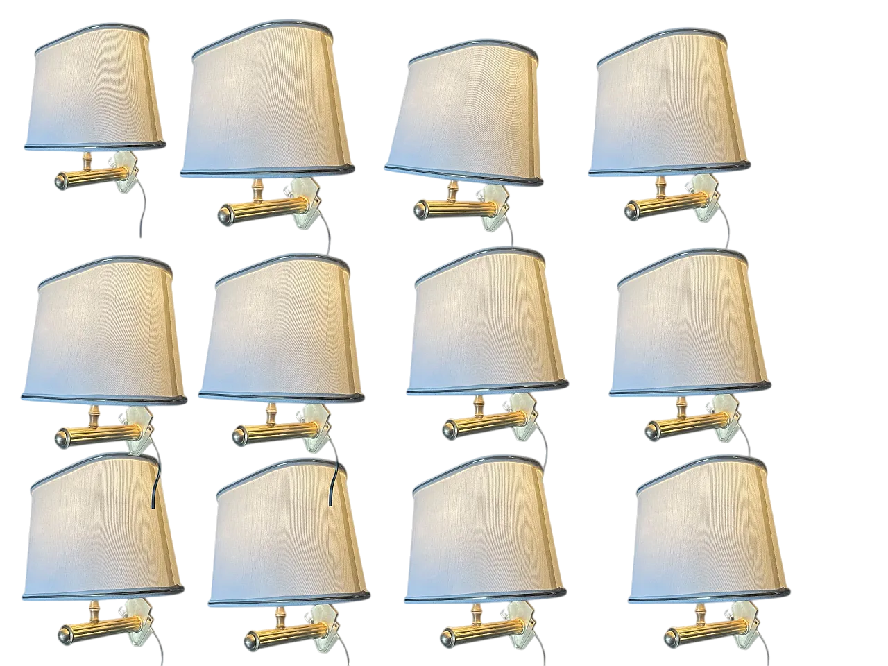 Additional item Information - Set of 12 Brass Wall Durcoes with Satin Shades, 1980s Elegant and Versatile, This set of 12 Vintage Brass Durcoes from the 1980s offers Timeless Charm and Warm Enlightenment, Ideal for Larger Interior Projects. Each dirty features in Satin, Creamy-Colored Fabric Shade with Refined Gold Trimming, Beautifully Complement The Polished Brass Arm and Fittings. • Origin: 1980s • Material: Brass with Satin Fabric Shades, Gold Trim Detailing • Dimensions: • Height: 24 cm • Width: 26 cm • Depth: 19 cm • Quantity: Set of 10 Notes • Condition: Excellent Vintage Condition, New Wiring Installed • Wiring: Compatible with EU, UK, and USA Electrical Systems These Discreces Are Perfect for Hospitality Settings, Elegant Corridors, or cohesive Residential Projects Requiring Multiple Lighting Points.