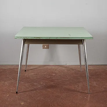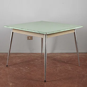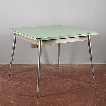 This square table with a green top, dating back to the 1960s, is an authentic piece of modernist that embodies the style and design of the time. Its clean lines and lively coloring make it a distinctive element, ideal for those who want to add a vintage and functional touch to their environment.