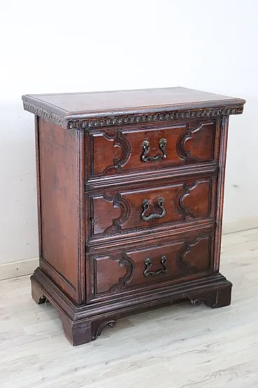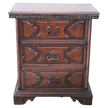 We present this rare and precious ancient Italian bedside table dating back to the first decades of the eighteenth century. Made of solid walnut wood and characterized by a front with decorative panels. Its design line is typical of the furniture of the Tuscany region. It may seem equipped with drawers, but it is an illusory effect because it has a door and a practical internal compartment with a shelf. Note that originally he probably had drawers that for practicality have been transformed into a door over the centuries.