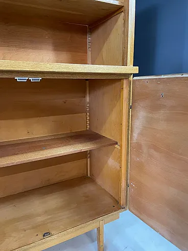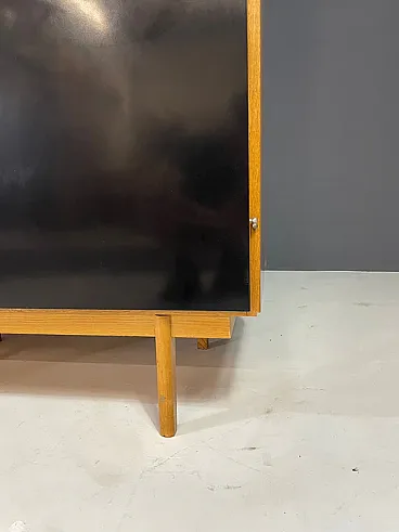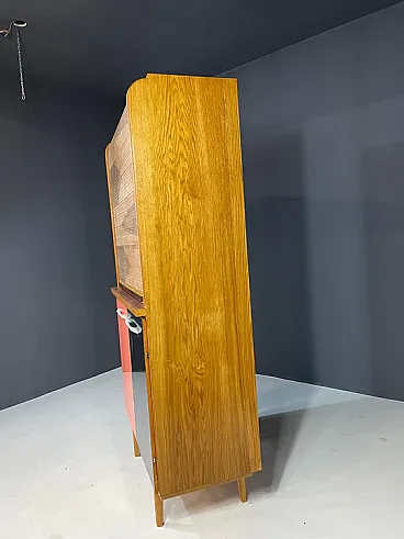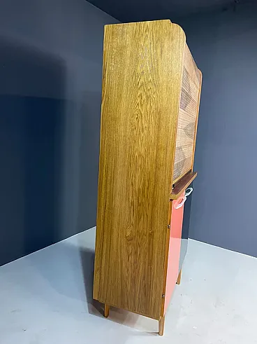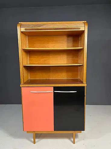 The upper part is characterized by a drum door with a characteristic reason for veneer, which opens to reveal an open shelf. The lower part includes two asymmetrical doors in colored laminate in the tones of coral and black, typical of the playful aesthetic of the Czechoslovak design of the sixties. The elegant metal handles and tapered legs complete the look.