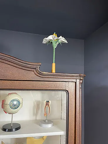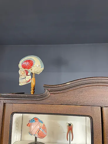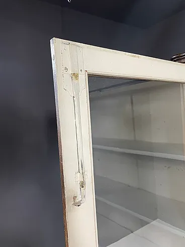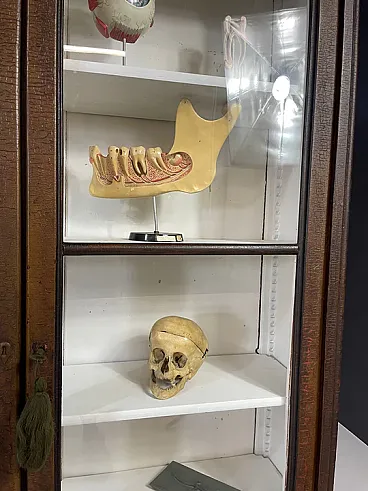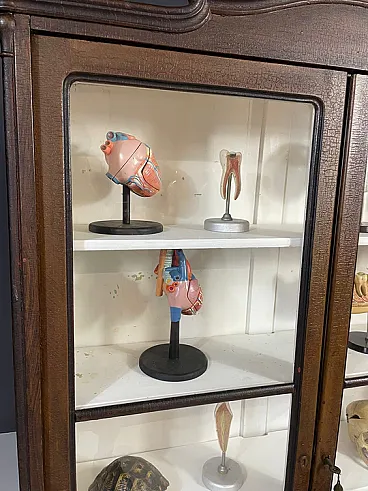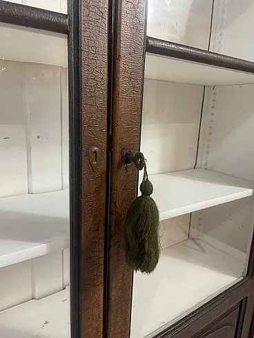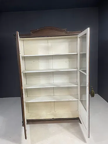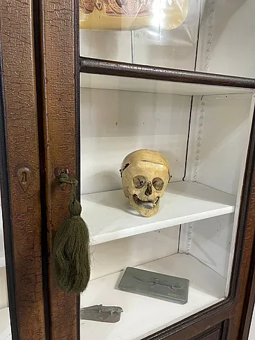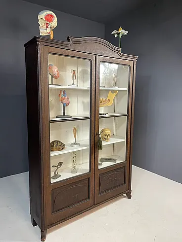 The piece features double glass doors finely worked with carved wooden details and original interior shelves painted in white. The original functional lock remained intact. Authentic historical school material can be purchased separately on request.