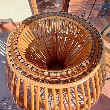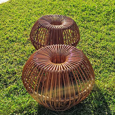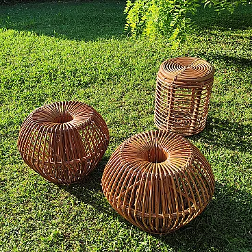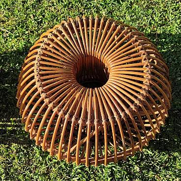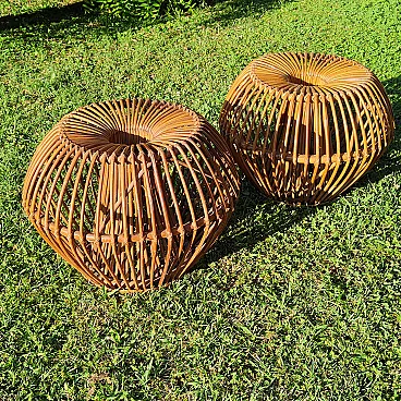 This bamboo and Rattan table/table was designed by Janine Abraham and Dirk-Jan Rol for Maison Rougier in France in the 1960s. This handmade object is in excellent condition and can easily be used as a table by adding a glass top. Janine Abraham (considered by many to be one of the first French women designers) and Dirk-Jan Rol are known for their iconic design, such as the revolutionary rattan armchairs, present in the collection of the Center Georges Pompidou in Paris. This extraordinary stool, like other works of this team of designer, has been inspired by both traditional Japanese architecture as well as by the American Mid-Century Modern design. Dimensions: Height 42 cm (16.5 inches) 60 cm diameter (23.6 inches) The price refers to a single stool. For the couple contact me.