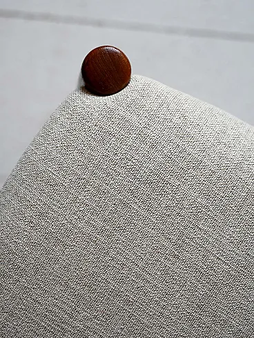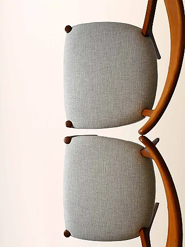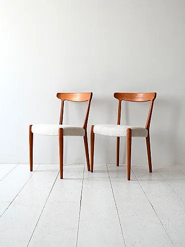 Teak structure with curved back and refined padded seat. Elegant lines and harmonious proportions. Pair of Scandinavian dining chairs dating back to the 1960s, with solid solid teak structure and padded seat refined in light fabric. The curved wooden backrest and the thin uprights reveal a probable Danish production, for the style of the processes and the consistency of the proportions. Design privileges soft shapes, balance and visual lightness, typical characteristics of the Nordic half -century furnishing. Good condition. They could present signs of time. Pleasure pay attention to the photographs.