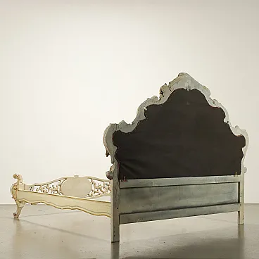 Lacquered double bed in Rococo style. Headboard carved with leaf motifs with fabric padding, richly carved and perforated footboard, lacquered with polychrome floral paintings on an ivory background.