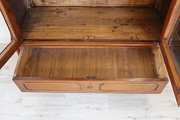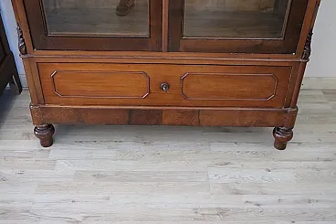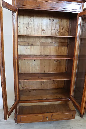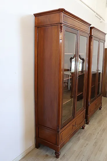 Made in walnut in a beautiful warm shade, they are easily combined with any furniture color. Characterized by a very linear structure, without excessive ornaments, a small carved decoration on the front softens its linearity. They have two glass doors and a practical drawer on the bottom to store further objects. Inside, three shelves for a large space for books.