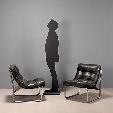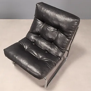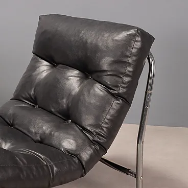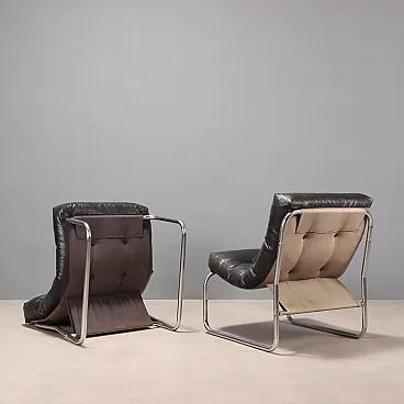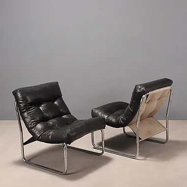 Pair of vintage armchairs with chromed metal frame, black leatherette seat.