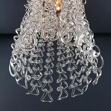 Scenographic chandelier from the Giogali series with approximately four hundred transparent Murano glasses, woven on a double chromed metal frame. Designed by Angelo Mangiarotti for a Vistosi production in the late 1960s.