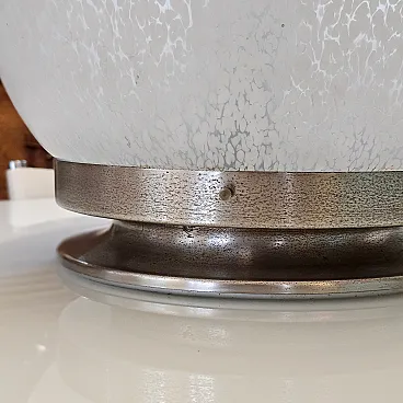 The highlight is its bright sphere, made of Murano glass with an extraordinary processing that creates an "ice" or "discontent" effect, giving the surface a unique and vibrant appearance. When on, this texture spreads a soft, warm and enveloping light, creating a magical and relaxing atmosphere in every environment. The base in dark metal metal offers an elegant contrast and solid stability to the majestic glass sphere.