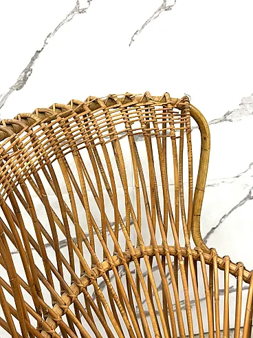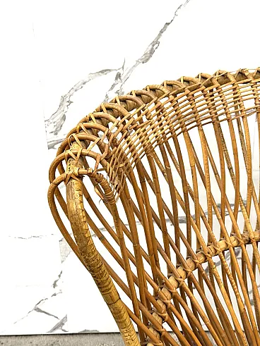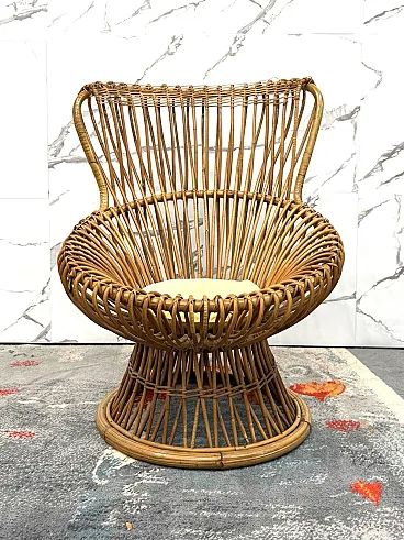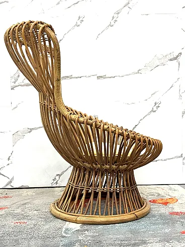 Franco Albini's Margherita armchair for Bonacina is an elegant example of Italian design of the twentieth century, which embodies the perfect fusion between artisan tradition and aesthetic innovation. With a curved rattan structure, typical of Albini's work, the armchair stands out for the fluid and harmonious lines, which recall the lightness and naturalness of the organic elements. The design, while maintaining a classic aesthetic, is at the same time modern and functional, with a comfortable and enveloping seat, ideal for unparalleled comfort. Margherita is not only an armchair, but a piece of design history, a symbol of an era in which the art of the intertwining and the innovative design meet, giving an icon that resists the passage of time. Present in the permanent collection of the Moma in New York. The article is in good conservative condition, slight signs of the time due to use and age.