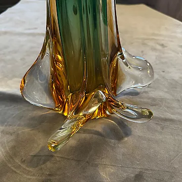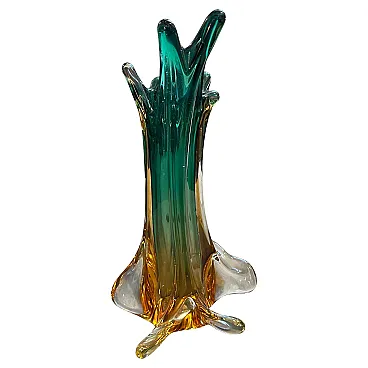 Exquisite 1970s Green and Yellow Sommerso Murano Glass Sculptural Vase. Immerse your space in the vibrant artistry of Murano with this stunning 1970s sculptural glass vase, masterfully crafted in the renowned Sommerso technique, strongly reminiscent of the iconic works by Seguso Vetri d'Arte. This piece is a testament to the unparalleled skill of Murano glassmakers and the bold aesthetic of mid-century Italian design. The vase showcases a captivating interplay of rich jewel tones, transitioning seamlessly from a deep emerald green at the top to a warm, radiant amber-yellow at the base. The Sommerso technique, meaning "submerged" in Italian, involves layering different colors of glass, creating a mesmerizing effect of colors floating within clear glass, giving the piece incredible depth and luminosity. Beyond its striking color palette, the vase boasts a dynamic and organic form. Its tall, elegant silhouette culminates in an expressive, "splash" or "flame" top, with individual glass elements reaching upwards like molten tendrils. The base flares out dramatically, providing stability and enhancing its sculptural presence. Each curve and peak reflects light beautifully, making this vase a true centerpiece from every angle. Excellent vintage condition, consistent with age and careful handling, free from chips or cracks.