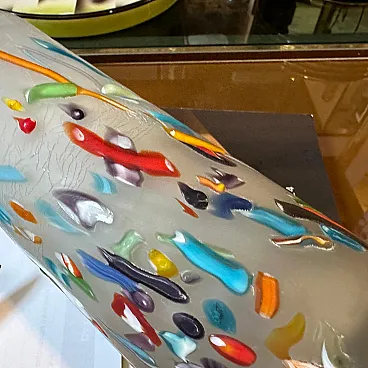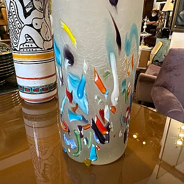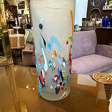 1980s Modern Murano Glass Cylinder Vase – Multicolor Millefiori Style Brighten up your space with this stunning 1980s Modern Murano glass cylinder vase, an eye-catching piece that celebrates the artistry of Italian glassmaking. Handcrafted in Murano, Italy, this tall cylindrical vase features a frosted crackle glass body with a vibrant, abstract millefiori-style pattern of multicolored glass inclusions in a joyful array of blues, oranges, reds, purples, and greens. The dynamic scatter of color appears to float across the satin-like surface, creating an impression of movement and spontaneity — hallmarks of postmodern design. The surface has a distinctive crackled texture, giving the vase additional depth and tactile appeal. Good vintage condition with small signs of use and age visible on the photos, any chips. This piece is perfect as a decorative accent, a statement vase for fresh or dried arrangements, or a collector's item for lovers of authentic Murano glass.