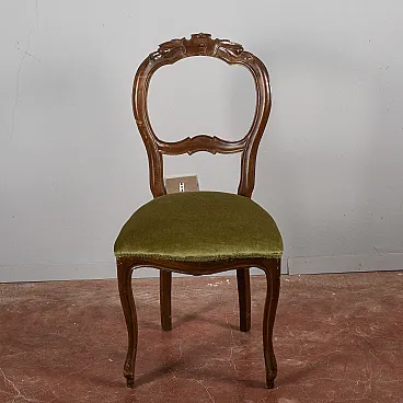 This single vintage chair, with its refined wooden structure and the seat covered in green velvet, embodies the elegance of a past era. Its classic design makes it a versatile piece, capable of adding a touch of charm to any environment, whether modern or traditional. The sinuous shape of the backrest and the carved legs highlight the artisan care. Ideal as a furnishing element for a study, entrance or bedroom, this chair offers both functionality and a considerable visual impact. Green velvet, in good condition, adds a soft texture and a vibrating point of color. Opening this piece means integrating an object in your home that tells a story, enhancing the space with authentic vintage design.