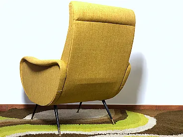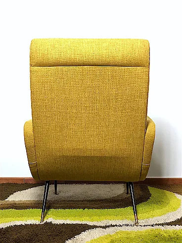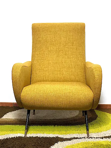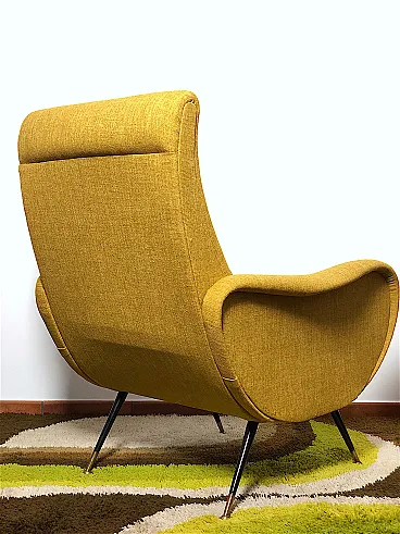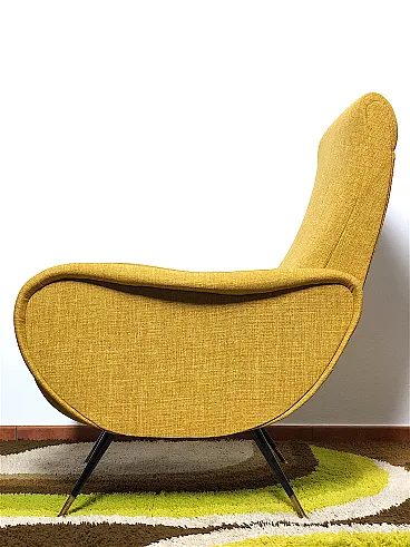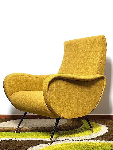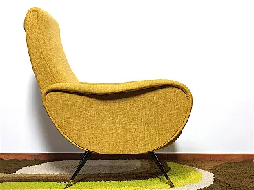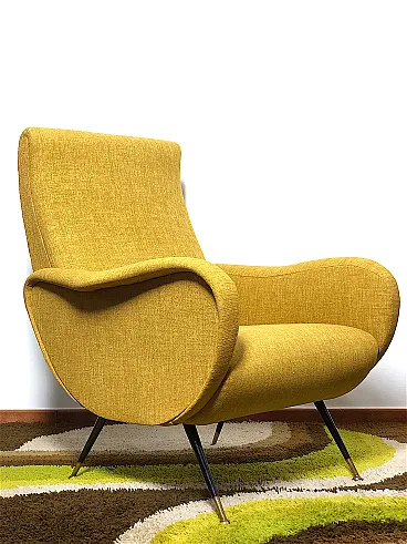 "Lady" 50s armchair Design attributed to Marco Zanuso masterpiece of Made in Italy, Lady was awarded with the gold medal at the IX Triennale di Milano in 1951. The armchair is of Italian manufacture, completely restored with new coating and interiors, light yellow color cotton fabric, unmistakable style of the designer's body Marco Zanuso, feet in the brass with a shape with shape to a shape cone, typical design of the 1950s. Perfect conditions measures height height 90 cm/width 67 cm/depth 90 cm/Setting height 40 cm/seat 50 cm 50 cm 50 cm