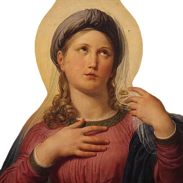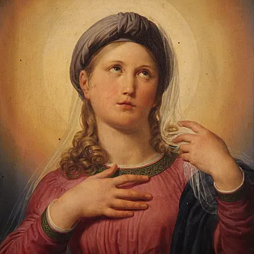 Magnificent Italian picture of the first half of the nineteenth century. Oil work on table depicting a splendid Virgin Mary, of considerable pictorial quality. The young woman is portrayed in a devotional attitude with her gaze facing upwards, immersed in a bright aura. The face is angelic, with soft and idealized features, with loose hair on the shoulders and covered by a light transparent veil. The dress is sumptuous, a pink tunic with green embroidery and gold and a blue mantle with a wonderful drapery.