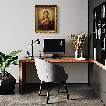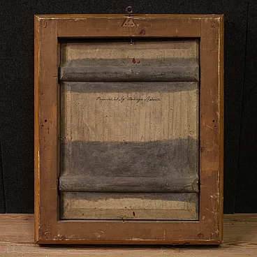 It presents on the back a hand inscription "Property of Mr. Ambrogio Baduelli" and a wax stamp, probably identifying the belonging to an important collection or Fedecommesso. Ideal for classic or eclectic environments, the work is perfect for a study or bedroom. It is not only a painting, but a luminous and spiritual presence that lives space with grace. Coeval frame in carved and golden wood, of beautiful decoration, with some signs of time. Overall operates in good conservative state. Painted light H 60 x L 46 cm.