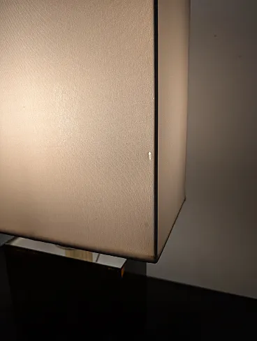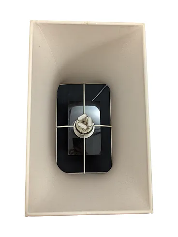 When on, the lamp emits a soft light that enhances the textures of the lampshade and gently reflects on the dark base, creating a pleasant visual contrast. A small flaw is visible on the side of the lampshade (a slight abrasion of the tissue), which however does not compromise the functionality or general aesthetic of the piece.