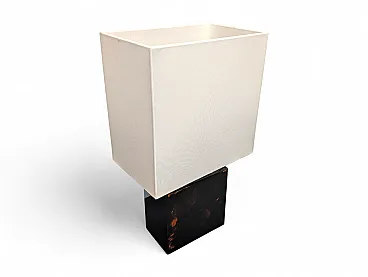 This elegant table lamp combines modern design and quality materials. The base is made of lucid resin with a turtle effect finish in the shades of dark brown and black, with light amber veins that add depth and refinement. The cubic form of the base gives a solid and contemporary appearance.