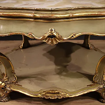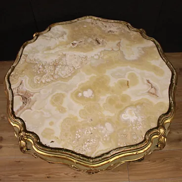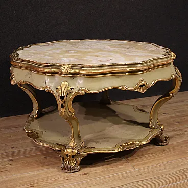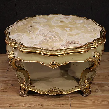 Low table from the Venetian living room of the mid -twentieth century. Finely sculpted, lacquered and gilded wooden wooden furniture in Louis XV style. Finished table from the center, in beautiful patina, equipped with two support floors. Lower wooden plan ideal for use as a magazine holder. Upper floor in original onyx built -in of excellent size and good service.