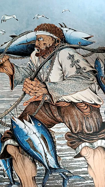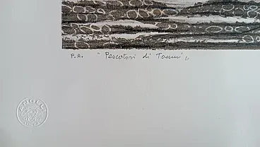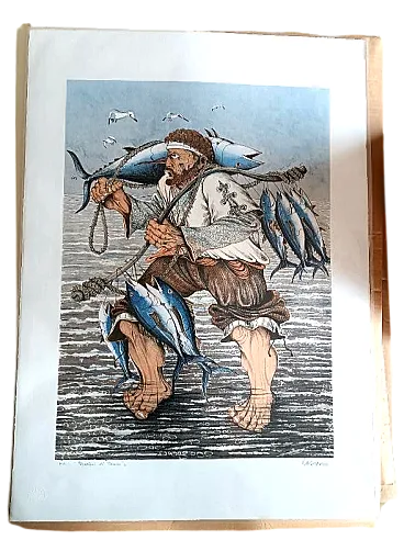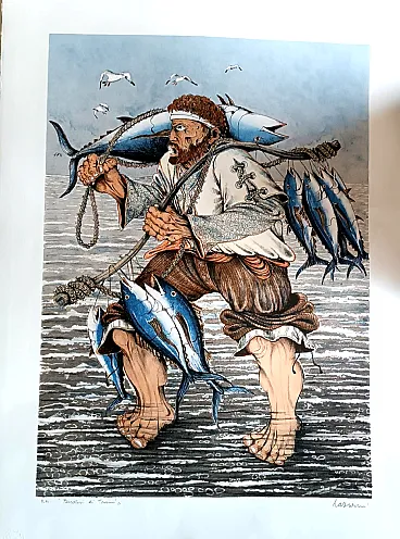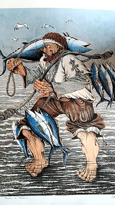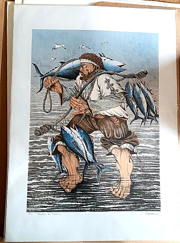 Beautiful and rare test of author by Giovanni Lazzarini (Viareggio 1923-2003) 70x50 cm signed in pencil title The fisherman of tuna With dry stamp of the printing angels of Lucca.