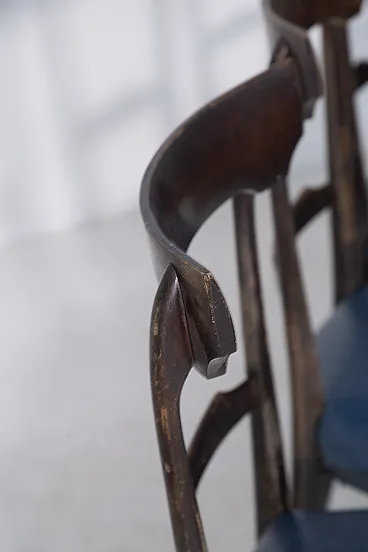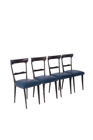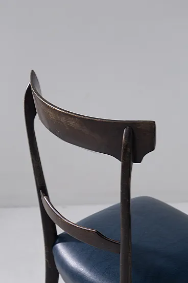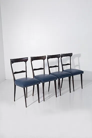This splendid set of four Mid-Century Modern dining chairs is attributed to ICO Parisi, one of the leading figures of post-war Italian design. Made of solid mahogany, each chair has blue eco -leather seats, elegantly fixed with two decorative metal studs that add a refined and functional touch.