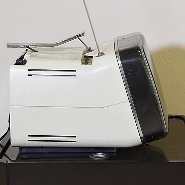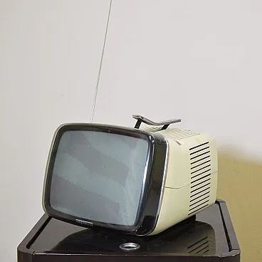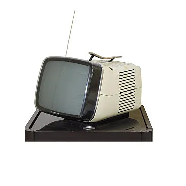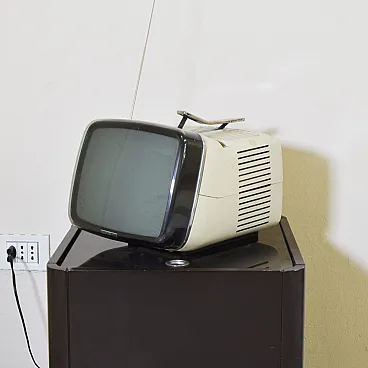 The Brionvega Algol 11 features an innovative and bold design, intended to bring the concept of television into a more modern era. The television's body is cubic, with a metal frame and a surface that evokes a sense of minimalism and contemporaneity. The television features a large cathode ray tube screen, which represented the cutting edge of technology at the time. The front is dominated by a large ventilation grille, which contributes to the product's almost "industrial" look while also lending it a certain elegance. The television turns on.