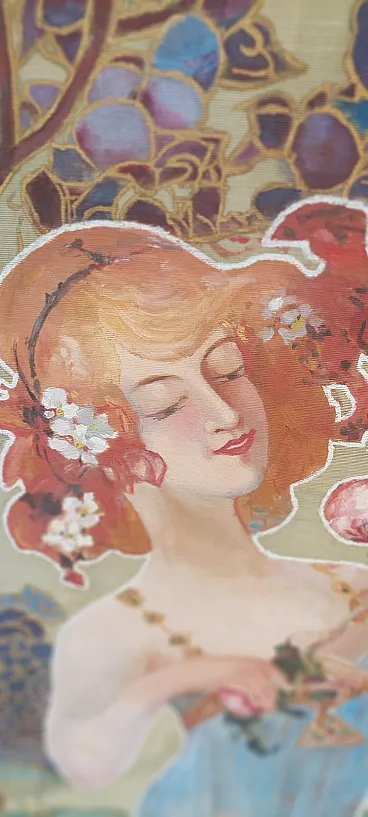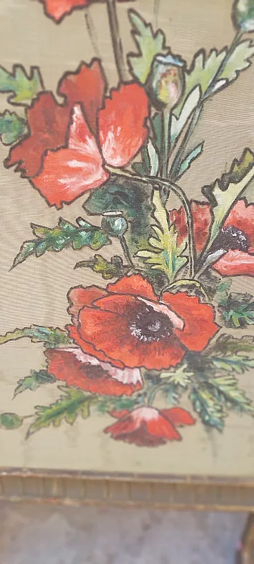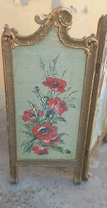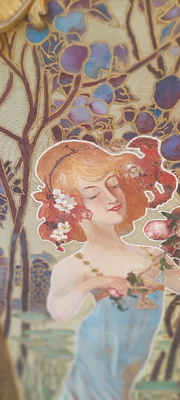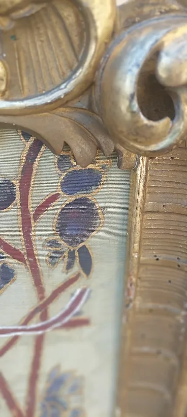 Paraints of the early 1900s in carved and golden golden golden wood, fabric panels painted with liberty motifs, completely original of the time. Good condition, small shortcomings and signs of time.