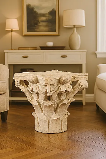 This white stone capital, with its grooves and detailed decorations, is an authentic piece of antiques that evokes a sense of historical size. Although there are small imperfections, these contribute to its charm and authenticity, testifying to the passage of time. Its classic design makes it a versatile element, capable of enriching a variety of environments. Perfect as a base for a sculpture, an important pot or also as an occasional table, this capital adds a touch of elegance and history. Its imposing presence can transform an anonymous corner into a focal point of great impact. It represents an opportunity to incorporate an ancient architectural element in a modern context, creating a visual contrast and a sophisticated atmosphere.