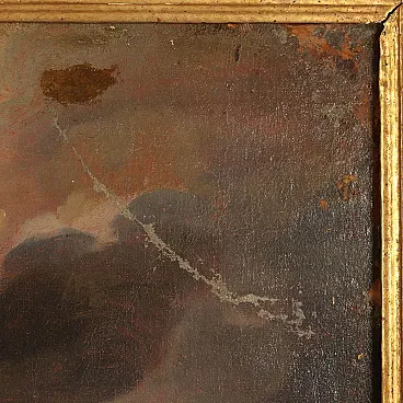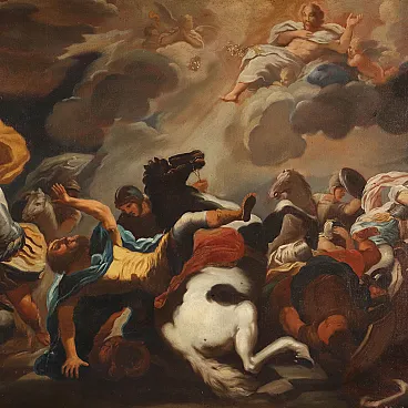 Oil on canvas. School of Luca Giordano. The scene depicts the conversion of Saint Paul, as recounted in the Acts of the Apostles. While traveling to Damascus to persecute the Christians, Saul (his name before his conversion), a Jew but a citizen of Rome, was suddenly enveloped in a divine light and heard the voice of Jesus asking him why he was persecuting him. This event led him to convert to Christianity, taking the name Paul and dedicating himself to spreading the Gospel. Saul is depicted falling from his horse, which has overturned on its side, while a beam of light dazzles him, coming from the cloud on which Christ is seated, surrounded by angels. Around Paul, Roman soldiers and his entourage are agitated, not understanding what is happening. The numerous figures, both human and animal, intertwine and overlap with great dynamism, supported by bright and vibrant colors. The work's style is reminiscent of Luca Giordano (1634-1705), the prolific 17th-century artist who translated modern Baroque concepts into painting with remarkable imagination and creativity, drawing on Caravaggio's naturalism and infusing it with new Baroque trends. His vast output spawned a large following of minor painters, who espoused his style. The painting was relined in the second half of the 19th century. It features paint loss at the lower right. It is presented in a late 19th-century gilded frame.