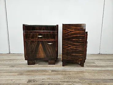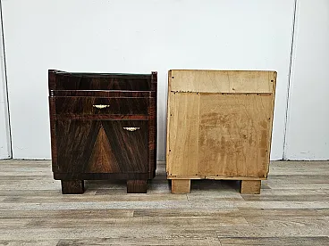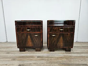 Refined art bedside tables in walnut root of the early 1940s with original transparent glass shelf of the time and container compartment. The bedside tables have a small but robust drawer, very sought after brass handles. They have been polished with oil and shellac, they have normal wear signs due by age and use.