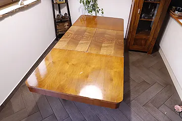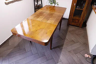 Elegant extendable dining table designed by Jindřich Halabala, made in the 1950s in Czechoslovakia. This table stands out with its natural walnut finish and beautiful wood grain pattern on the extendable part.