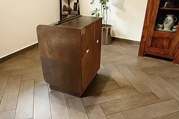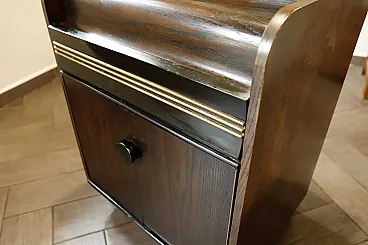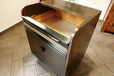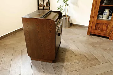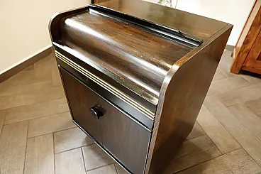 The Supraphon bar cabinet from 1957 represents an authentic piece of mid-century Czechoslovak design. This elegant model features a distinctive tambour roll-top compartment above and two-door storage below, adorned with subtle golden lines.