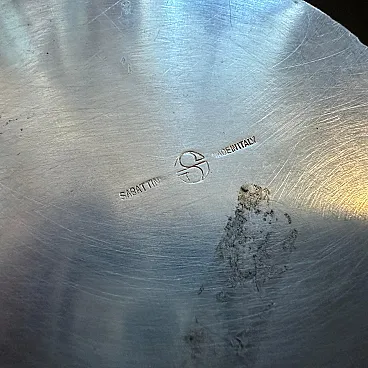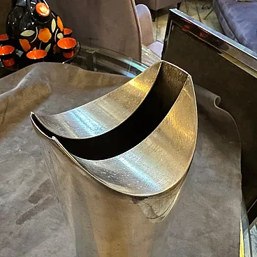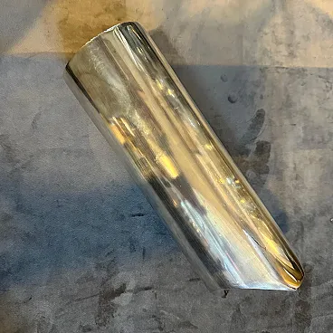 Striking 1970s Minimalist Silver-Plated Sculptural Vase by Lino Sabattini for Sabattini Argenteria Introduce a piece of iconic Italian design into your collection with this remarkable minimalist sculptural vase, conceived by the celebrated designer Lino Sabattini. Produced in the 1970s for his renowned company, Sabattini Argenteria, this vase exemplifies Sabattini's mastery of form and his commitment to sleek, modern aesthetics. This elegant vessel is crafted from silver-plated metal, showcasing a fluid, elongated silhouette that tapers gently towards the base. Its most captivating feature is the beautifully executed asymmetric opening at the top, which creates a dynamic and sculptural presence, even when empty. The reflective silver-plated surface catches and plays with light, enhancing its clean lines and sophisticated appeal. Lino Sabattini, often referred to as the "designer of silver," was celebrated for his innovative approach to metalware, blending functionality with artistic expression. This vase is a prime example of his ability to transform simple materials into objects of refined beauty and modern artistry. Perfect as a standalone sculptural object, this vase will also elegantly display a single stem or a minimalist floral arrangement. It is an ideal addition for collectors of 20th-century design, or anyone looking to add a touch of understated luxury and sophisticated minimalism to their home or office. The base is clearly marked "SABATTINI" with the distinctive "S" logo and "MADE IN ITALY," confirming its authenticity and provenance. Excellent vintage condition, consistent with age and use. The silver plating exhibits a beautiful, natural patina and minor surface wear commensurate with its age, adding to its authentic character.
