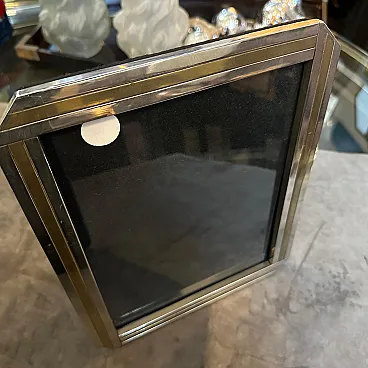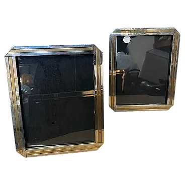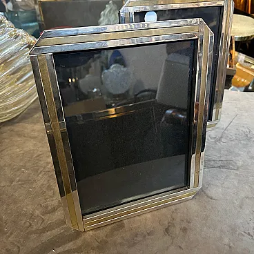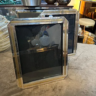 Chic Pair of 1970s Willy Rizzo Style Mid-Century Modern Silver-Plated Picture Frames Capture your cherished memories in true 1970s style with this exquisite pair of picture frames, masterfully crafted in the iconic aesthetic of Willy Rizzo. These frames embody the sleek sophistication and glamorous allure that defines Rizzo's influential Mid-Century Modern designs, making them a perfect accent for any contemporary or vintage-inspired interior. Each frame features a striking architectural form with stepped or angled edges, a hallmark of the era's bold and geometric sensibilities. They are beautifully rendered in a silver-plated finish, accented with subtle brass details that create a luxurious two-tone effect. This elegant combination of metals adds depth and visual interest, elevating them beyond mere frames into sculptural objects. These substantial and high-quality frames are designed to stand upright, making them ideal for displaying on a console table, desk, bookshelf, or mantelpiece. Perfect for showcasing photographs, artwork, or even as decorative objects on their own, this pair offers a touch of refined vintage glamour. They are a must-have for collectors of Willy Rizzo's work or anyone seeking to infuse their space with a distinctive Mid-Century Modern Italian flair. Excellent vintage condition, consistent with age and use. The silver plating and brass accents show minor surface wear and a beautiful natural patina commensurate with their age, enhancing their authentic character.