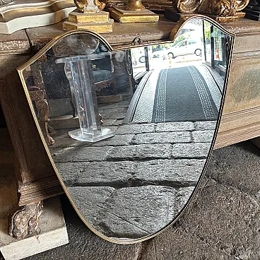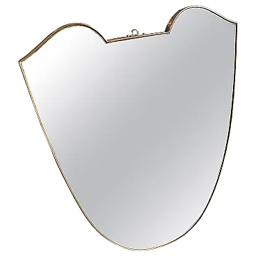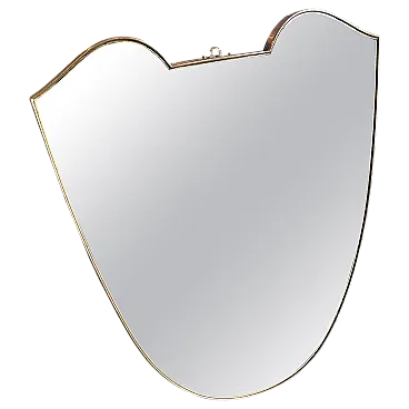 A solid brass wall mirror designed and manufactured in Italy in the manner of Gio Ponti, who used this type of mirror in the most beautiful houses in Milan in the '50s. The wall mirror is a stunning piece of vintage design that embodies the essence of mid-century aesthetics, showcasing his signature blend of functionality, elegance, and modernist influences. With its bold and eye-catching presence, it becomes a focal point in any room. The frame of the mirror is crafted from solid brass, a popular material choice during the mid-century era. The warm golden hue of the brass complements the mirror's reflective surface, creating a harmonious visual effect. This captivating mirror features a unique, organic shield-like silhouette, characteristic of Ponti's inventive forms. The sleek, solid brass frame beautifully outlines its distinctive shape, providing a warm, golden gleam that highlights its vintage allure. The quality of the brass, now with a lovely aged patina, speaks to its enduring craftsmanship and authenticity. Excellent vintage condition, consistent with age and use. The brass frame exhibits a beautiful natural patina. The mirror glass is clear with minimal signs of age, consistent with its vintage character.