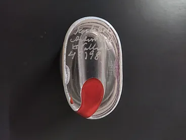 Produced by Kosta Boda of Sweden. A beautiful piece of the Galaxy series of the 80s. The piece is blown and worked entirely by hand with applied glass accents, the main body is transparent, decorated with opaque white glass paste, a darker red wire design applied on the main body and a dark red stain on the front. Signed under the base "Kosta Boda B. Vallien", Artist coll. engraved with needle. B Vallien 48118; Height 6 cm. and with a catalog number.