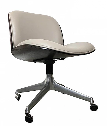 Office armchair produced by MIM, design by Ico Parisi. The armchair is made with a curved wooden shell, upholstered seat and back with upholstery (new) made of ice-colored leather. The base is in die-cast aluminum with four spokes and swivel casters. Manufacturing label on the back of the backrest. Completely restored. Seat height: cm 45.