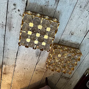 A Glamorous Pair of 1970s Mid-Century Modern Italian Brass and Faceted Glass Square Wall Sconce. These exquisite pieces perfectly encapsulate the Mid-Century Modern aesthetic with a decadent flair, showcasing a brilliant interplay of light, brass, and faceted glass. Each sconce is meticulously crafted with a robust brass frame, forming a grid that cradles numerous sparkling, multi-faceted glass jewels. The clear glass elements are expertly arranged to catch and refract light, creating a dazzling display reminiscent of fine jewelry. The square form is both contemporary and timeless, making these sconces versatile additions to a variety of design schemes. When illuminated, these sconces cast a warm, radiant glow, producing a captivating effect of diffused light and intricate shadows across your walls. They are ideal for adding a luxurious accent to a living room, dining area, hallway, or even a sophisticated bedroom. Excellent vintage condition. The brass exhibits a beautiful, age-appropriate patina, enhancing its character. The glass jewels are intact and sparkling, with minimal signs of wear consistent with age. Fully functional and ready for installation. Professional installation is recommended.