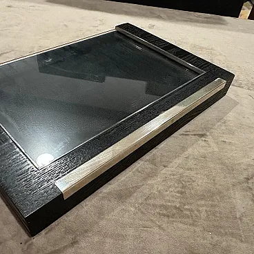 Sleek 1980s Modern Sterling Silver and Ebonized Wood Picture Frame by Silvan, Italy This exquisite picture frame is a testament to sophisticated Italian craftsmanship by the esteemed manufacturer Silvan. This frame seamlessly blends luxurious materials and a minimalist design, making it a timeless accent for any contemporary or classic interior. The frame features a striking contrast between its rich, dark ebonized wood and the gleaming sterling silver accents. The wood frame, treated to achieve a deep, almost black finish with visible grain, provides a solid and substantial presence. Integrated into the bottom edge and one side are clean, polished sterling silver bars, which add a touch of understated opulence and a distinct modern edge. A hallmark visible on the silver (referencing "925" for sterling silver and an Italian maker's mark like "200 FI", confirms its authenticity and high-quality material. The design is clean and architectural, allowing the materials themselves to be the focus, while the reflective qualities of the silver beautifully complement the depth of the ebonized wood. Perfect for showcasing a treasured photograph, an art print, or even a small mirror, this Silvan frame is not just a functional item but a statement piece that embodies the luxurious yet understated aesthetic popular in the 1980s. Excellent vintage condition. The ebonized wood shows minimal wear, and the sterling silver is polished, presenting beautifully.