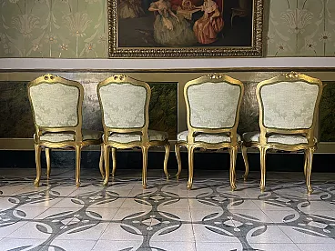 These four chairs without armrests are a sublime expression of Baroque art. Made of finely carved and golden wood, they have sinuous lines and volute decorations that capture the eye. The light green damask coating adds a touch of refined opulence, making them perfect for a sumptuous dining room or as prominent elements in a valuable living room. They represent the Louis XV style, a period of French decorative art of the eighteenth century characterized by curved lines, asymmetrical motifs and elaborate ornaments. The chairs have the typical cabriolet shape with curved legs, rounded back and golden carvings that highlight the elegance and refinement of the Rococo style.