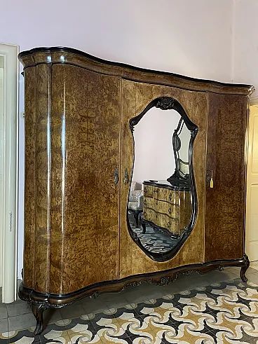 A magnificent walnut wardrobe, destined to become the fulcrum of any bedroom. The central mirror, elegantly shaped, not only captures the light but visually expands the space, while the natural veins of the wood create an unrepeatable design, giving each piece a character of absolute uniqueness.