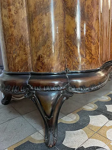 This refined Venetian specimen, probably dating back to the first half of the twentieth century, draws inspiration from the sumptuous Italian Baroque style of the eighteenth century. Its sinuous form, the shiny finishes and the use of the highest quality walnut root are an expression of the elegance and the artisan skill typical of the Venetian Abanistry.