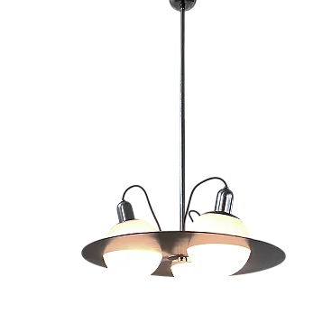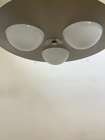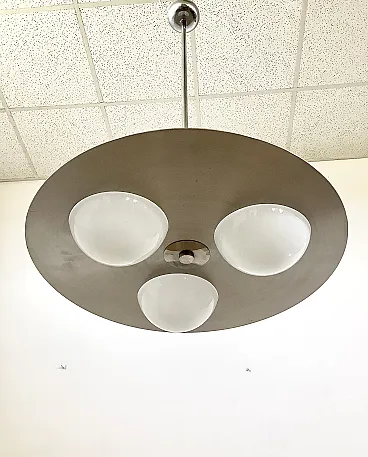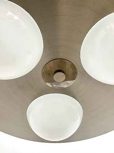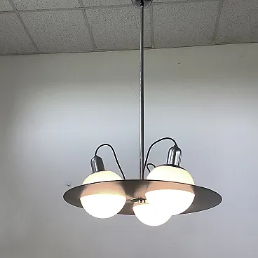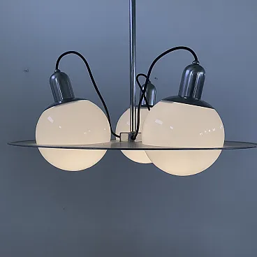 70s chandelier consisting of a perforated aluminum disc in which three opal glass spheres are partially inserted which create a suggestive aesthetic and luminescent effect. The chandelier does not present any trademark but from the characteristics it can be attributed to the production of companies such as Stilnovo or Article, leader in the production of lighting in Italy at that time.