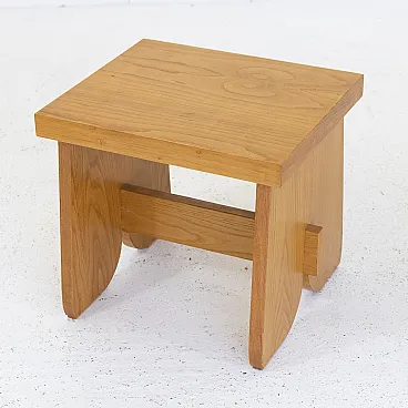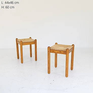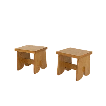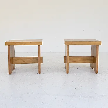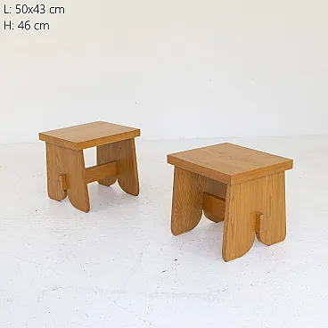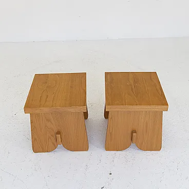 Pair of stools made of ash wood, characterized by a sculptural and linear design. The legs have a curved profile with visible interlocking and central crossbar, which gives stability and personality to the structure. The compact design makes them versatile, perfect both as seats and as low tables. Dimensions: Width: 50 cm Depth: 43 cm Height: 46 cm Good general conditions, with slight signs of use compatible with age.