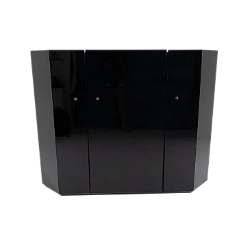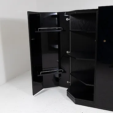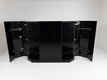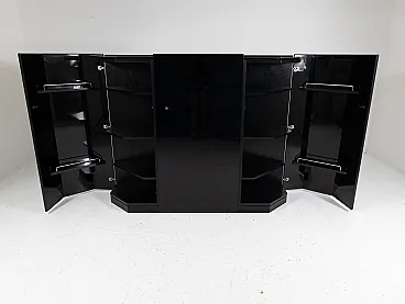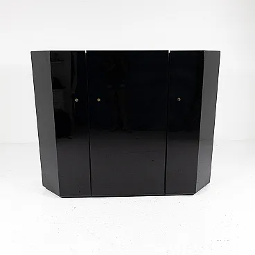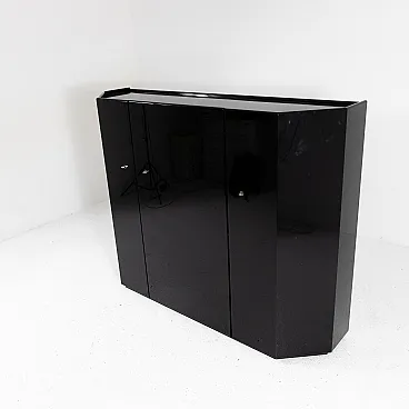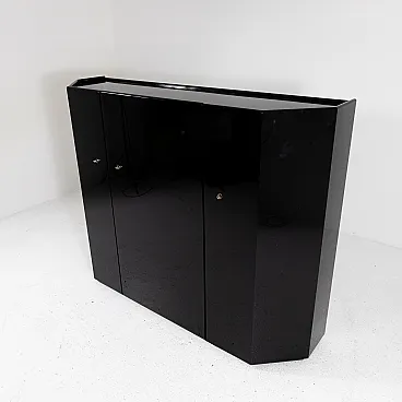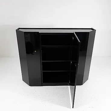 His iconic design bar designed by Kazuhide Takahama for Gavina, "Bramante" model, dating back to the 70s. The structure is made of glossy black lacquered wood, with clear geometric shapes and elegant lines that reflect the rationalist aesthetic of the time. The side and front doors open to reveal large internal compartments with integrated shelves and holders, offering a perfect feature for use as a bars or container.