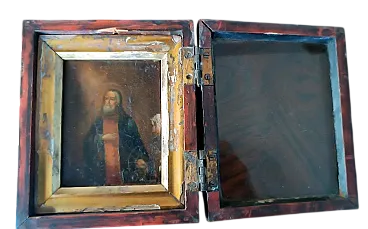 Ancient small travel icon depicting San Serafino di Sarov - tempera on wood - Presented in a 19th century box with gilded wooden frame - Painted in the eighteenth century - Registration in the upper right corner. Eastern Europe Work ordered in excellent conditions, with signs of time. Box size: 14.5 cm x 12.5 cm, painting: 9.5 x 7.5 cm