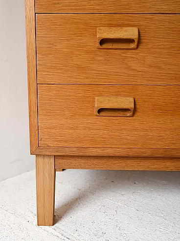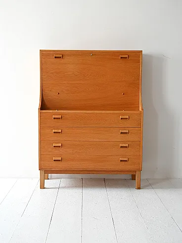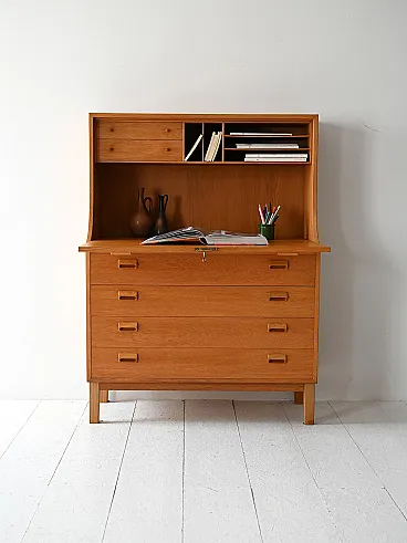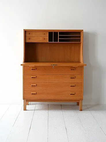 Scandinavian Secrétaire of the 1960s designed by Børge Mogensen for Søborg Møbler. The oak structure has four large drawers with carved handles and square -based legs. The upper limelight, complete with a functioning original key, opens to form a desk plan and reveals a compartment with two internal drawers, a shelf with partitions and a day sector.
