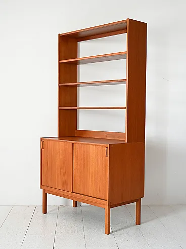 Scandinavian library of the 1960s designed by B. Fridhagen for Bodafors, made of teak with slender structure. The visible shelves are flanked by a container compartment with sliding doors and adjustable internal shelf. The handles are in curved teak, a typical detail of the Swedish abanisterial of the time. The original brand is present inside.