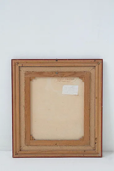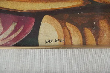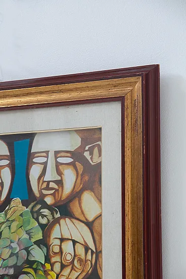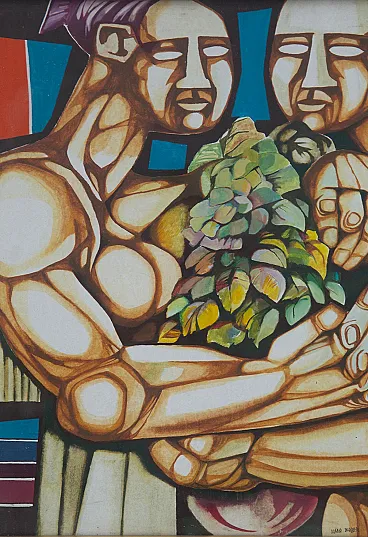 The work is attributable to the painter Mario Barbieri, dated 1977. The scene depicts two monumental, stylized, and geometric male figures clutching a bunch of grapes or a branch of leaves in their arms. The style is strongly expressionist-geometric, with massive bodies broken down into planes of light and shadow. The faces have simplified, almost "archaic" or mask-like features, with echoes of cubism and social muralism (something reminiscent of the figurative language of artists such as Leger, Sironi, or Mexican muralists). The background is composed of fields of pure color (blue, red, black) that give rhythm to the composition. The subject evokes values of strength, work, community, and the fertility of nature: very consistent with the Italian and international art of the 1960s and 1970s, which was linked to social and symbolic realism. Probably oil on canvas or tempera/acrylic on canvas (the texture suggests more acrylic or vinyl tempera, typical of the 1970s). Signed lower right (initials/sign). Contemporary wooden frame with fabric mat. There is also a label/stamp on the back: "Executed at the Accademia Permanente Ambrosiana d'Arte – Milan" This tells us that the painting was exhibited or created in an academic setting in Milan, at the Accademia Ambrosiana d'Arte. Therefore, we can place it within the context of Milanese academic production of the early 1970s. The measurements are with frame