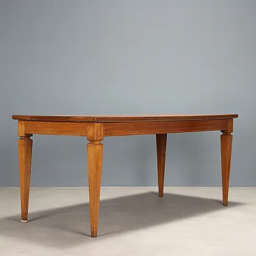 Large, classic 20th-century Italian-made dining table with truncated pyramid legs and an extendable rectangular top with drawers. Made of mahogany veneer.