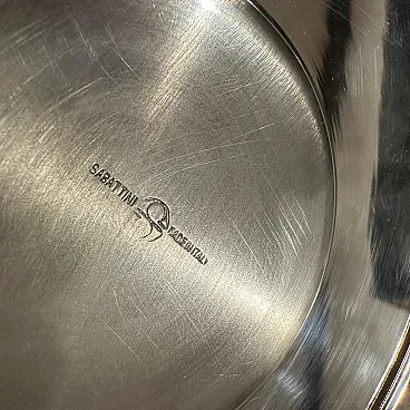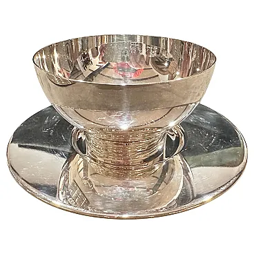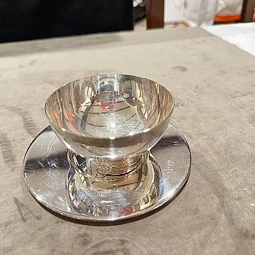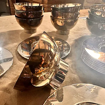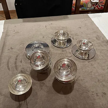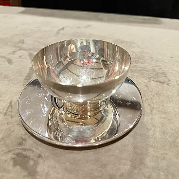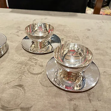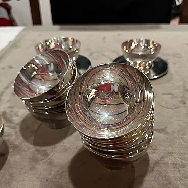 Rare 1980s Lino Sabattini Minimalist Set of Twelve Silver-Plated Ice Cream Cups and Plates - Made in Italy Discover the understated elegance of Italian modernist design with this remarkable set of twelve silver-plated ice cream cups and matching plates, created by the celebrated designer Lino Sabattini in the 1980s. Known for his "purity of line" and sculptural forms, Sabattini's work is highly sought after by collectors of 20th-century design, and this set is a perfect example of his refined aesthetic. This exquisite set embodies Sabattini's minimalist philosophy. Each cup features a clean, simple bowl shape elevated on a subtly ribbed, tapered base, perfectly complemented by a sleek, unadorned circular plate. The polished silver-plated finish reflects light beautifully, enhancing the elegant curves and making these pieces truly shine on any table. Marked "SABATTINI MADE IN ITALY," these pieces are authenticated originals from his prestigious workshop. While designed as ice cream cups, their versatile and timeless design makes them ideal for serving a variety of desserts, fruit, sorbets, or even small appetizers. This complete set of twelve ensures you're perfectly equipped for elegant entertaining, whether for intimate gatherings or larger dinner parties. they are in perfect condition, probably never used.